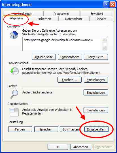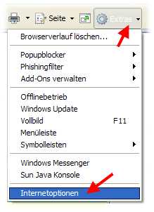 Menü EXTRAS >> Internetoptionen >>