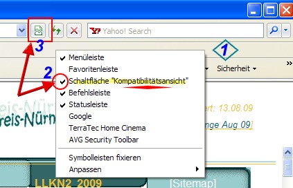 Der IE 8 besitzt eine sogenannte "Kompatibilitätsansicht", der die Version 8 auf eine frühere Version zurücksetzt und unsere "alten" Webseiten damit wie gewohnt anzeigt. Diese Kompatibilitätsansicht kann man im IE 8 z. B. auf folgende Art "einschalten":