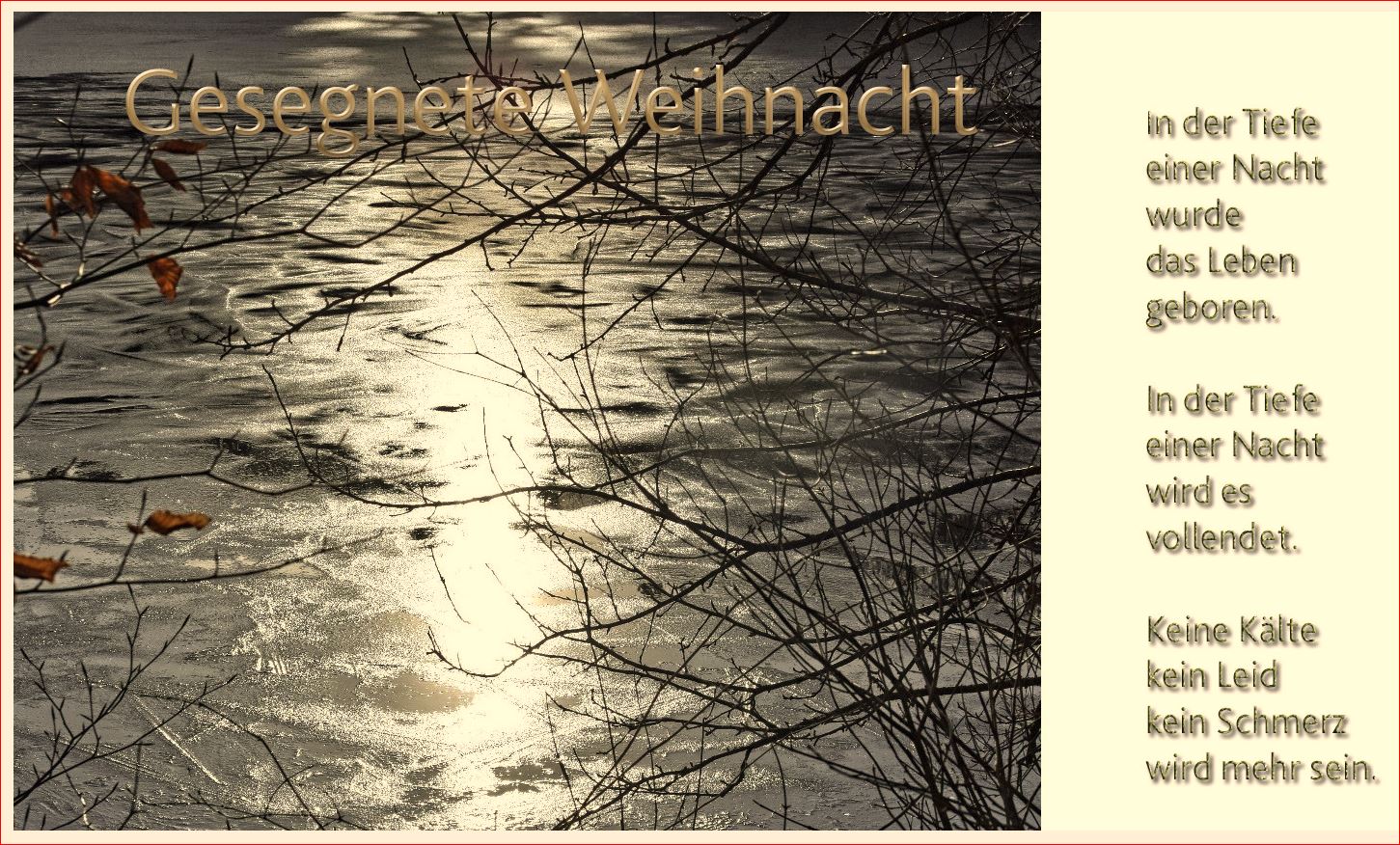 2412.2_Friede, sprach der Engel, und allen Menschen ein Wohlgefallen. Wir sehnen uns doch alle nach Frieden. Wie wäre es, wenn wir selbst friedvoll - den Leidenden beistehen in ihrer Not, - den Trauernden unser Mitgefühl als wärmende Decke anbieten, - den Armen ein Teil unserer Habe geben würden? Wenn wir allen Menschen mit einem friedvollen Herzen begegen könnten, egal wer und was sie sind. Wie wäre es, wenn wir heute versuchen würden, dies zu tun, nur heute, nur diesen einen Tag es versuchen? Wären wir dann nicht auch so ein Bote Gottes? So bitte ich darum, dass ER uns mit Seiner Kraft und Stärke durchflutet, damit wir den Frieden bringen dürfen. Jeder an dem Ort wo er ist, zu den Menschen die bei ihm sind, ihm nahe sind - innen und außen. Diesen Frieden erbitte und ich wünsche euch allen diesen Frieden und Wohlgefallen. Damit wir in der Heiligen Nacht alle durchleuchtet werden - und dem Stern der Erlösung folgen. Gesegnete Weihnacht!!! Manfred |